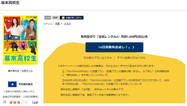 ツタヤディスカスは、準新作・話題作・旧作が4枚までなら、無料お試し期間中にレンタルができるので、「幕末高校生」の映画を無料で視聴した後も14日間以内なら他のシリーズ作品や見たかった映画も無料でレンタルすることができますよ。