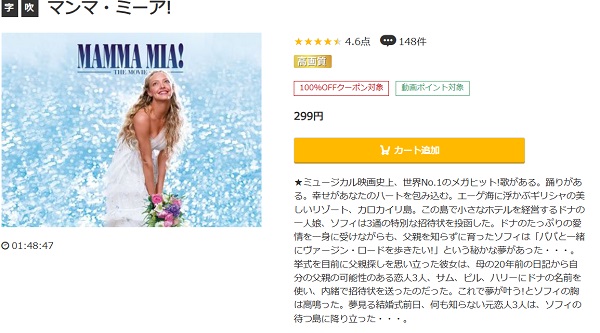 music.jpは、初回登録で1,600Ptが貰えるので「マンマ・ミーア!」の映画を無料で見ることができます。