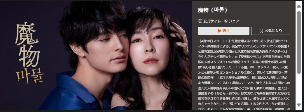 ほかにも「魔物(마물)」の出演している麻生久美子のその他の作品も、一緒に楽しむことができます。