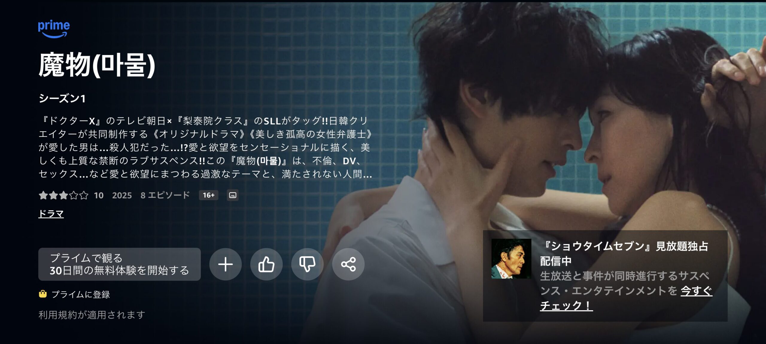 Amazonプライムには30日間の無料トライアルがあり、期間中にドラマ「魔物(마물)」を全話視聴できます。