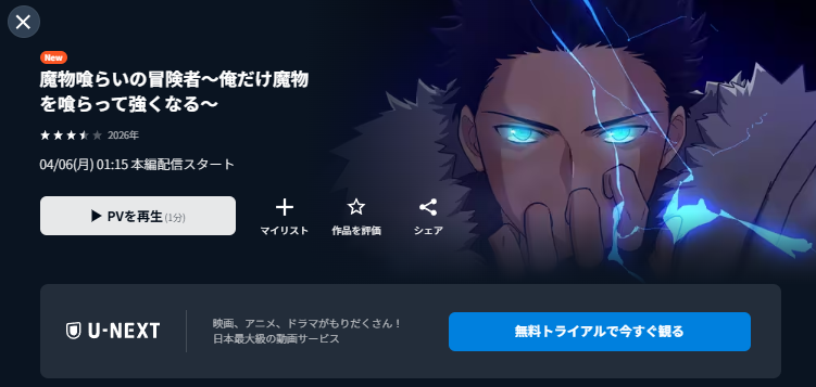 2026年4月2日(木)から放送スタートのアニメ「魔物喰らいの冒険者~俺だけ魔物を喰らって強くなる~」の配信を全話視聴できる動画配信サービスを紹介します。