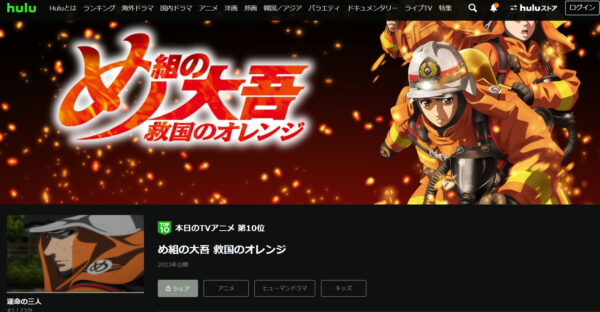 2024年11月現在、動画配信サイトHuluではアニメ「め組の大吾 救国のオレンジ」の1話~最終話(23話)を配信しております。