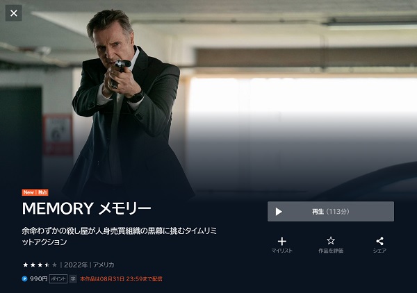 お試し期間が31日間なのと初回特典で600ポイント付与されるので、無料ではありませんが映画「MEMORY メモリー」の動画を視聴することができます。
