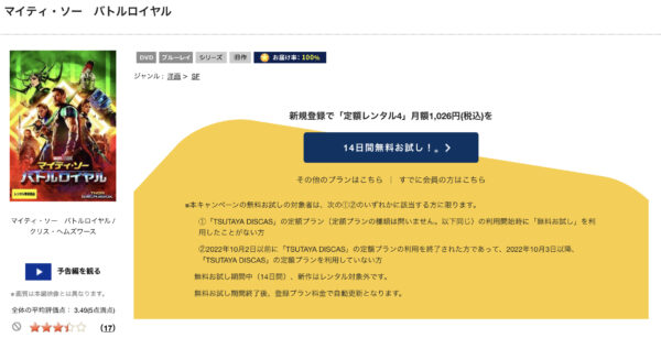 ツタヤディスカスは、準新作・話題作・旧作が4枚までなら、無料お試し期間中にレンタルができるので、「マイティ・ソー バトルロイヤル」の映画を無料で視聴した後も14日間以内なら他のシリーズ作品や見たかった映画も無料でレンタルすることができますよ。