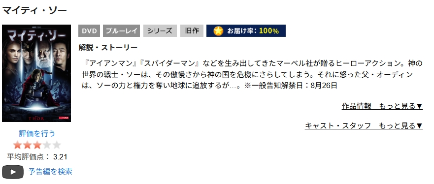 映画「マイティ・ソー」は旧作なので、DVDレンタルすればフル視聴が可能です。