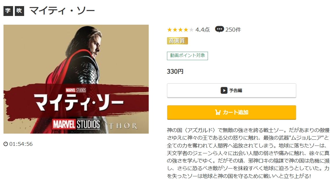 初回登録時に1,600円分のポイントがもらえるので、330ポイントでレンタル配信している映画「マイティ・ソー」はフルで視聴できます。