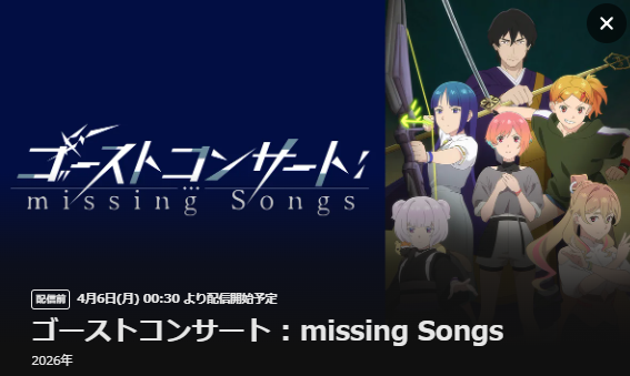 2026年4月5日(日)から放送スタートのアニメ「ゴーストコンサート : missing Songs」の配信を全話視聴できる動画配信サービスを紹介します。