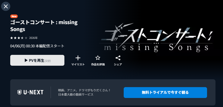 先に結論をお伝えすると、アニメ「ゴーストコンサート : missing Songs」は動画配信サービス『U-NEXT』で配信予定です。