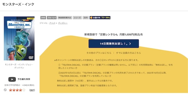 そして、映画「モンスターズ・インク」はツタヤディスカスで配信しているので、無料でDVDレンタルが可能です。