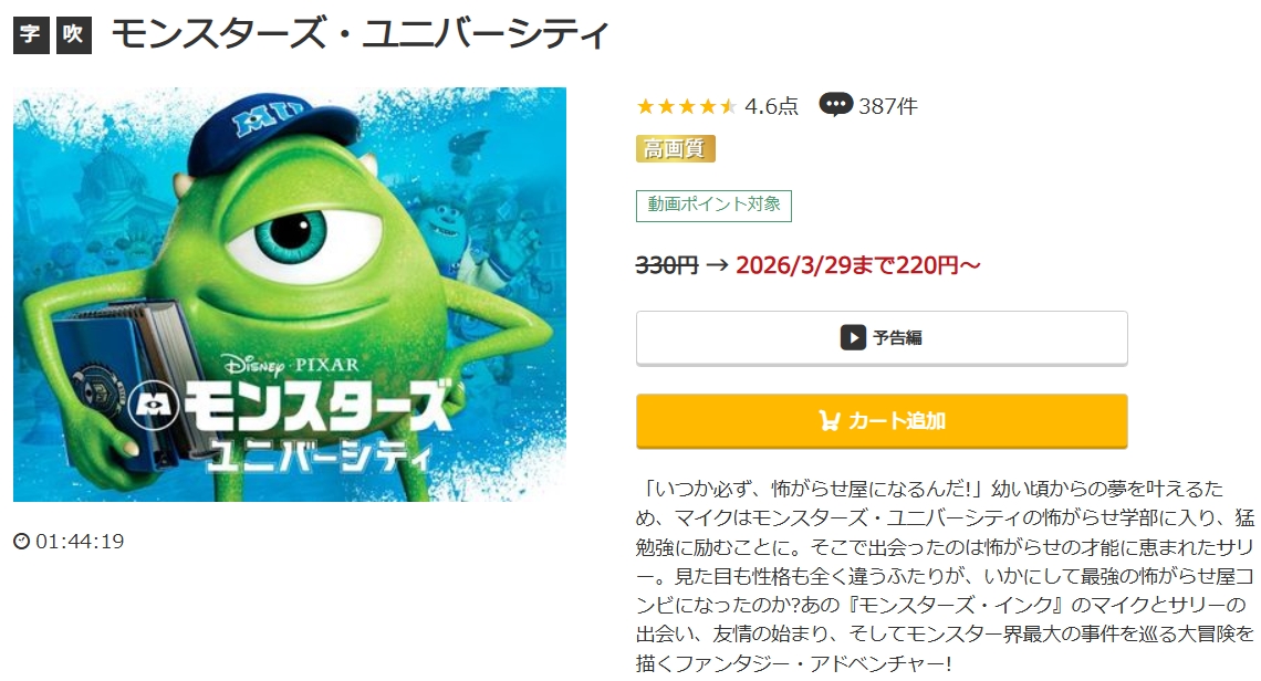 初回登録時に1,600円分のポイントがもらえるので、220ポイントでレンタル配信している映画「モンスターズ・ユニバーシティ」は無料で視聴できます。