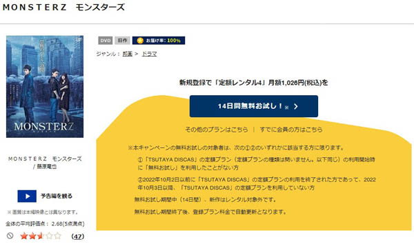 そして、映画「MONSTERZ モンスターズ」はツタヤディスカスで配信しているので、無料でDVDレンタルが可能です。