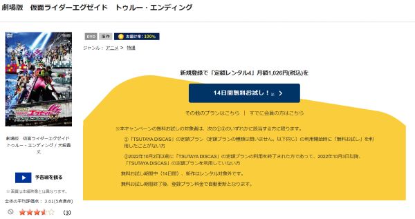 ツタヤディスカスは、準新作・話題作・旧作が4枚までなら、無料お試し期間中にレンタルができるので、「劇場版 仮面ライダーエグゼイド トゥルー・エンディング」の映画を無料で視聴した後も14日間以内なら他のシリーズ作品や見たかった映画も無料でレンタルすることができますよ。