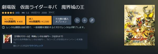 しかし、映画「劇場版 仮面ライダーキバ 魔界城の王」はレンタル作品のため、300円かかってしまい無料視聴することができません。