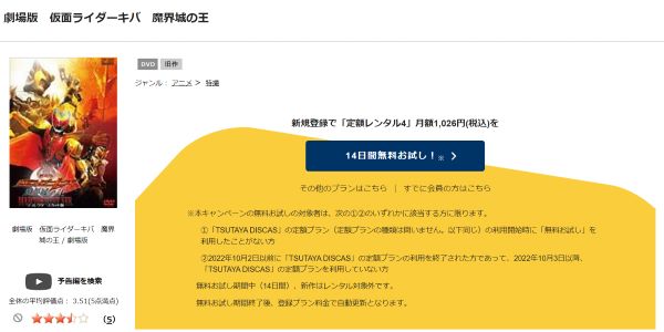 そして、映画「劇場版 仮面ライダーキバ 魔界城の王」はツタヤディスカスで配信しているので、無料でDVDレンタルが可能です。