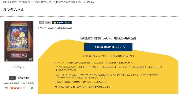 TSUTAYA DISCASは、準新作は8枚まで、話題作・旧作は枚数制限なしでお試し期間中に無料レンタルができ「ガンダムさん」のアニメは、旧作なので無料視聴可能です。