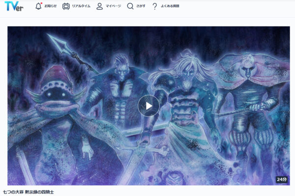 先に結論をお伝えすると、放送のアニメ「七つの大罪 黙示録の四騎士」はTverにて全話ではありませんが、見逃し無料配信が実施されております。