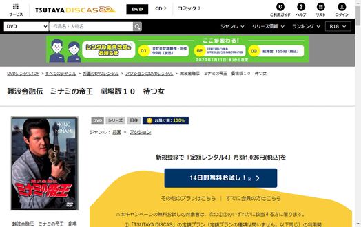 ツタヤディスカスは、準新作・話題作・旧作が4枚までなら、無料お試し期間中にレンタルができるので、「難波金融伝ミナミの帝王劇場版partX「待つ女」」の映画を無料で視聴した後も14日間以内なら他のシリーズ作品や見たかった映画も無料でレンタルすることができますよ。