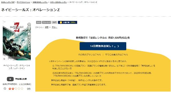 そして、映画「ネイビーシールズ:オペレーションZ」はツタヤディスカスで配信しているので、無料でDVDレンタルが可能です。