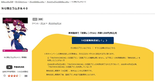 TSUTAYA DISCASは、準新作は8枚まで、話題作・旧作は枚数制限なしでお試し期間中に無料レンタルができ「NG騎士ラムネ&40」のアニメは、旧作なので無料視聴可能です。