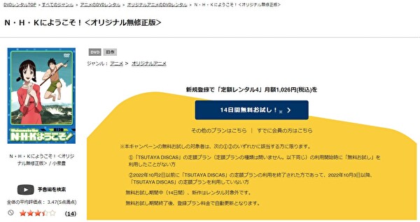 動画配信サービスとは少し違い、DVDレンタルサービスになりお試し期間で、「N・H・Kにようこそ!」の動画を全話視聴することができます。