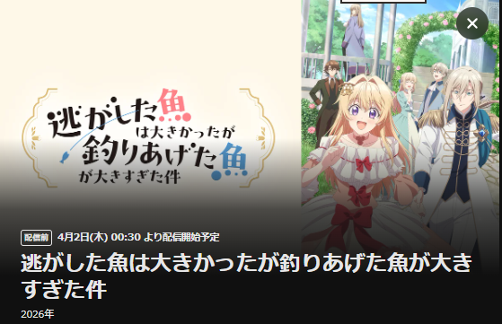 2026年4月1日(水)から放送スタートのアニメ「逃がした魚は大きかったが釣りあげた魚が大きすぎた件」の配信を全話視聴できる動画配信サービスを紹介します。