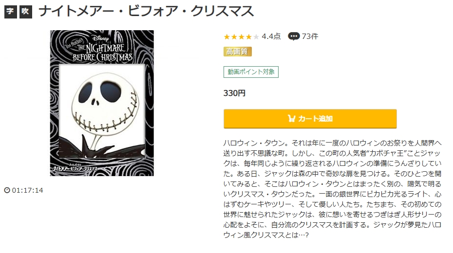 初回登録時に1,600円分のポイントがもらえるので、330ポイントでレンタル配信している映画「ナイトメアー・ビフォア・クリスマス」は無料で視聴できます。
