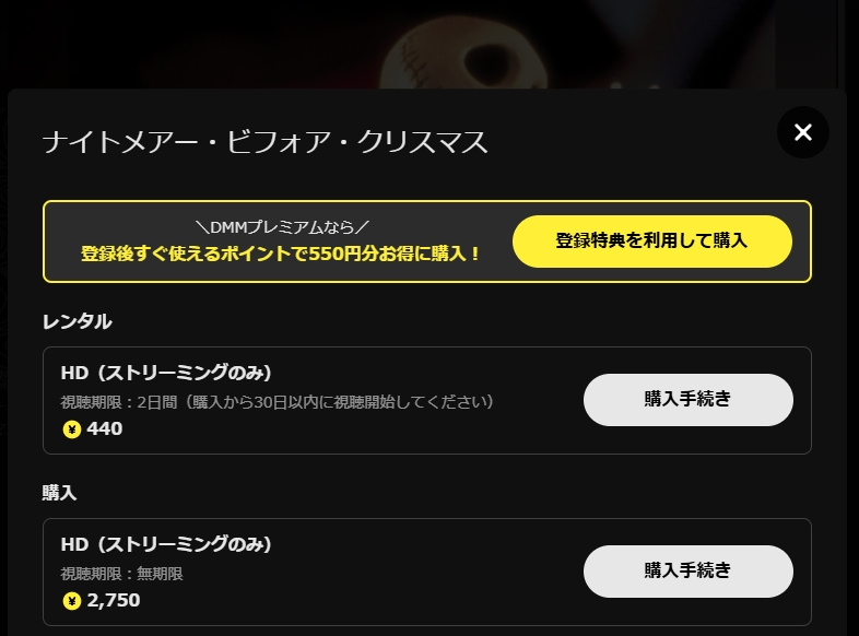 2026年4月現在、DMM TVでは「ナイトメアー・ビフォア・クリスマス」の動画が見放題ではありませんが、初回14日間の無料トライアルとともに550ポイントをもらうことができ、440ポイントでレンタルできる「ナイトメアー・ビフォア・クリスマス」を、お得に見ることができます。