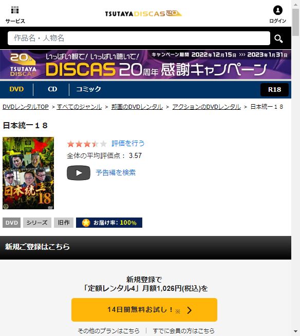 TSUTAYA DISCASで映画「日本統一18」をDVDレンタルで無料視聴
