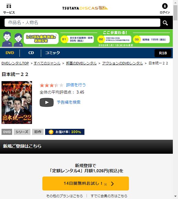 ツタヤディスカスは、準新作・話題作・旧作が4枚までなら、無料お試し期間中にレンタルができるので、「日本統一22」の映画を無料で視聴した後も14日間以内なら他のシリーズ作品や見たかった映画も無料でレンタルすることができますよ。