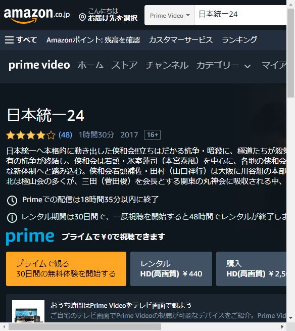 映画「日本統一24」はAmazonプライムビデオでもフルで視聴することができます。