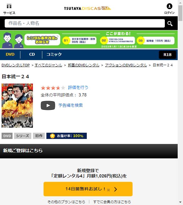 ツタヤディスカスは、準新作・話題作・旧作が4枚までなら、無料お試し期間中にレンタルができるので、「日本統一24」の映画を無料で視聴した後も14日間以内なら他のシリーズ作品や見たかった映画も無料でレンタルすることができますよ。