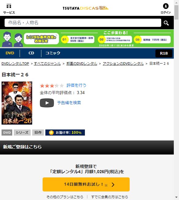 ツタヤディスカスは、準新作・話題作・旧作が4枚までなら、無料お試し期間中にレンタルができるので、「日本統一26」の映画を無料で視聴した後も14日間以内なら他のシリーズ作品や見たかった映画も無料でレンタルすることができますよ。