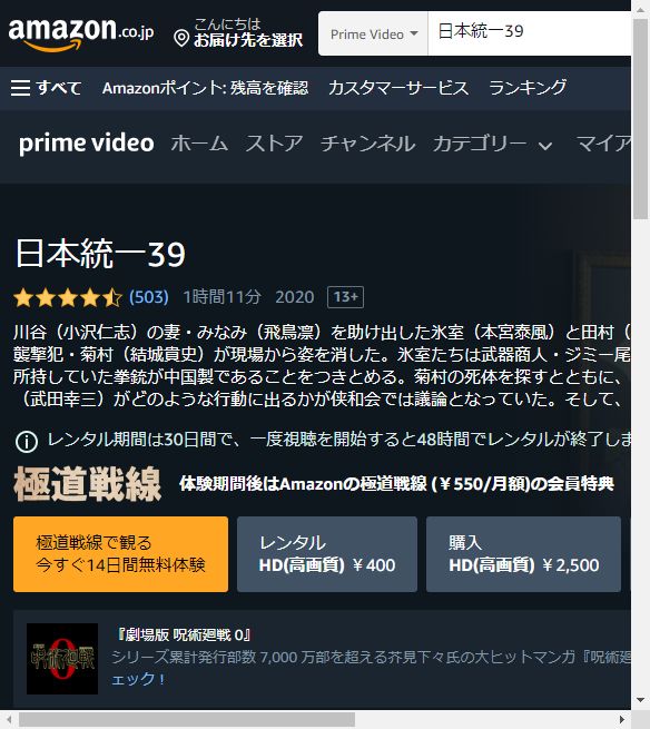 人気の動画配信サービスのAmazonプライムビデオで映画「日本統一39」の映画がフルで視聴できるか調査しました。