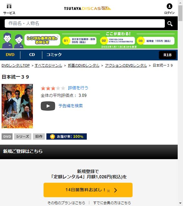 ツタヤディスカスは、準新作・話題作・旧作が4枚までなら、無料お試し期間中にレンタルができるので、「日本統一39」の映画を無料で視聴した後も14日間以内なら他のシリーズ作品や見たかった映画も無料でレンタルすることができますよ。