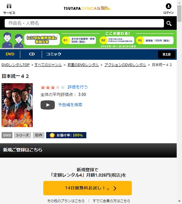 ツタヤディスカスは、準新作・話題作・旧作が4枚までなら、無料お試し期間中にレンタルができるので、「日本統一42」の映画を無料で視聴した後も14日間以内なら他のシリーズ作品や見たかった映画も無料でレンタルすることができますよ。