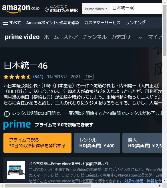 Amazonプライムビデオで映画「日本統一46」をフルで無料視聴