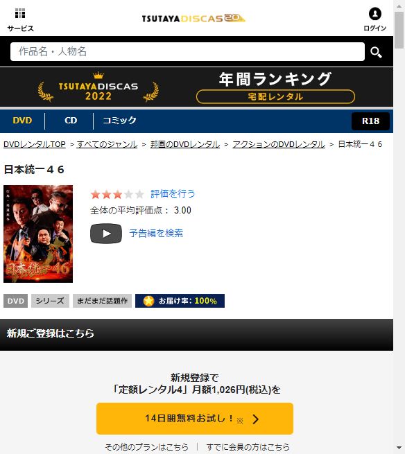 そして、映画「日本統一46」はツタヤディスカスで配信しているので、無料でDVDレンタルが可能です。