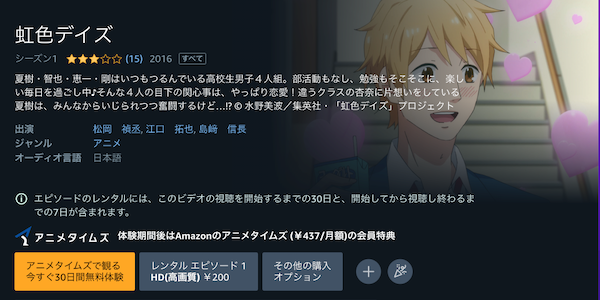 人気の動画配信サイトAmazonプライムでも、アニメ「虹色デイズ」を視聴できるか調査しました。