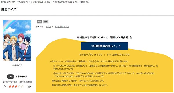 TSUTAYA DISCASは、準新作は8枚まで、話題作・旧作は枚数制限なしでお試し期間中に無料レンタルができ「虹色デイズ」のアニメは、旧作なので無料視聴可能です。
