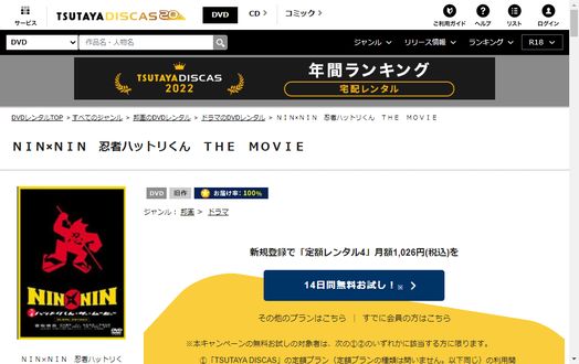 お試し期間が14日間なので、映画「NIN×NIN 忍者ハットリくん THE MOVIE」の動画や関連動画も含め、TSUTAYA DISCASなら自分のペースでゆっくり視聴できます。