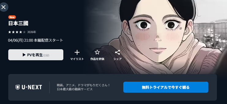 先に結論をお伝えすると、日本「日本三國」は動画配信サービス『U-NEXT』で配信予定です。