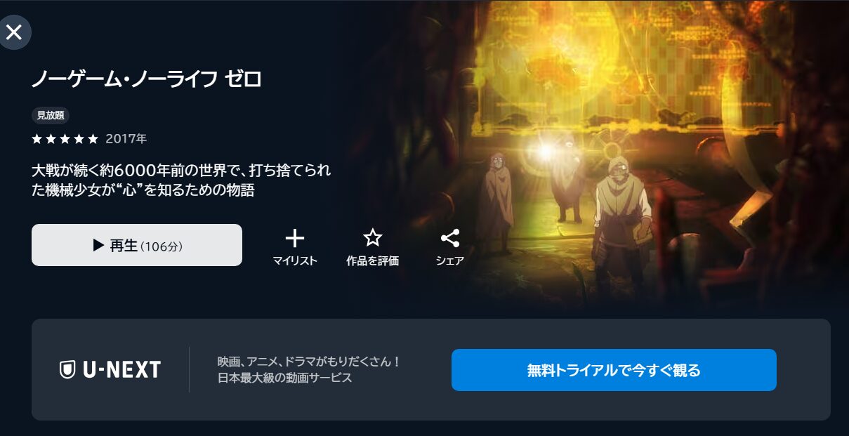 U-NEXTで、映画「ノーゲーム・ノーライフ ゼロ」は見放題で配信しているので無料期間を利用すれば「ノーゲーム・ノーライフ ゼロ」の動画をフルで視聴することができます。