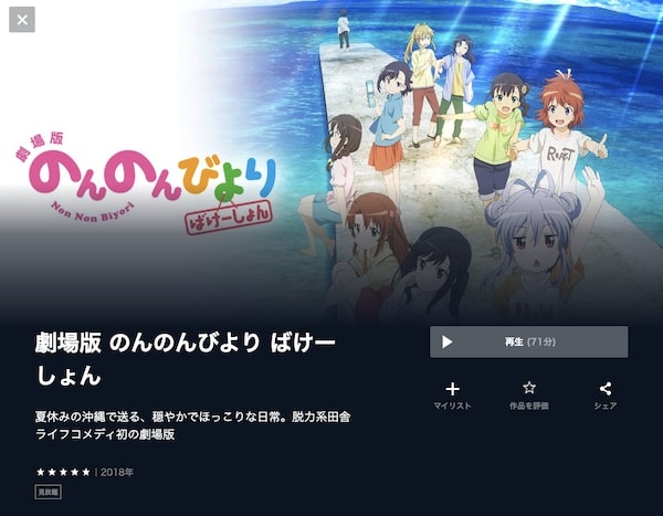 Netflixで、今後「劇場版 のんのんびより ばけーしょん」の配信を待つよりU-NEXTで「劇場版 のんのんびより ばけーしょん」の映画は配信してるのでU-NEXTのお試し期間を使ってフルで無料視聴することをおすすめします。