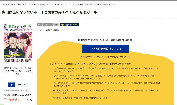 そして、映画「奥田民生になりたいボーイと出会う男すべて狂わせるガール」はツタヤディスカスで配信しているので、無料でDVDレンタルが可能です。
