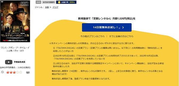 そして、映画「ワンス・アポン・ア・タイム・イン・上海」はツタヤディスカスで配信しているので、無料でDVDレンタルが可能です。