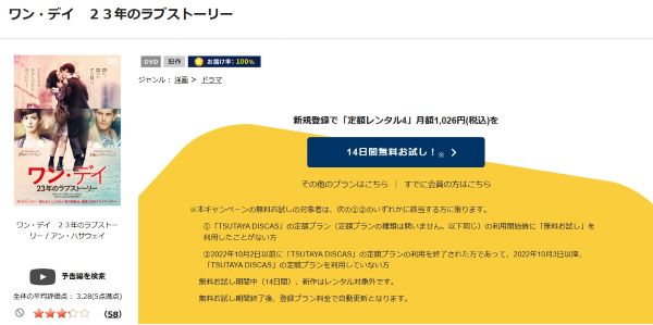 そして、映画「ワン・デイ 23年のラブストーリー」はツタヤディスカスで配信しているので、無料でDVDレンタルが可能です。