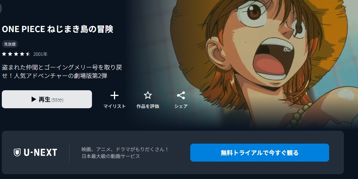 また、映画「ONE PIECE ねじまき島の冒険」のシリーズ作品もトライアル中にフル視聴が可能です。