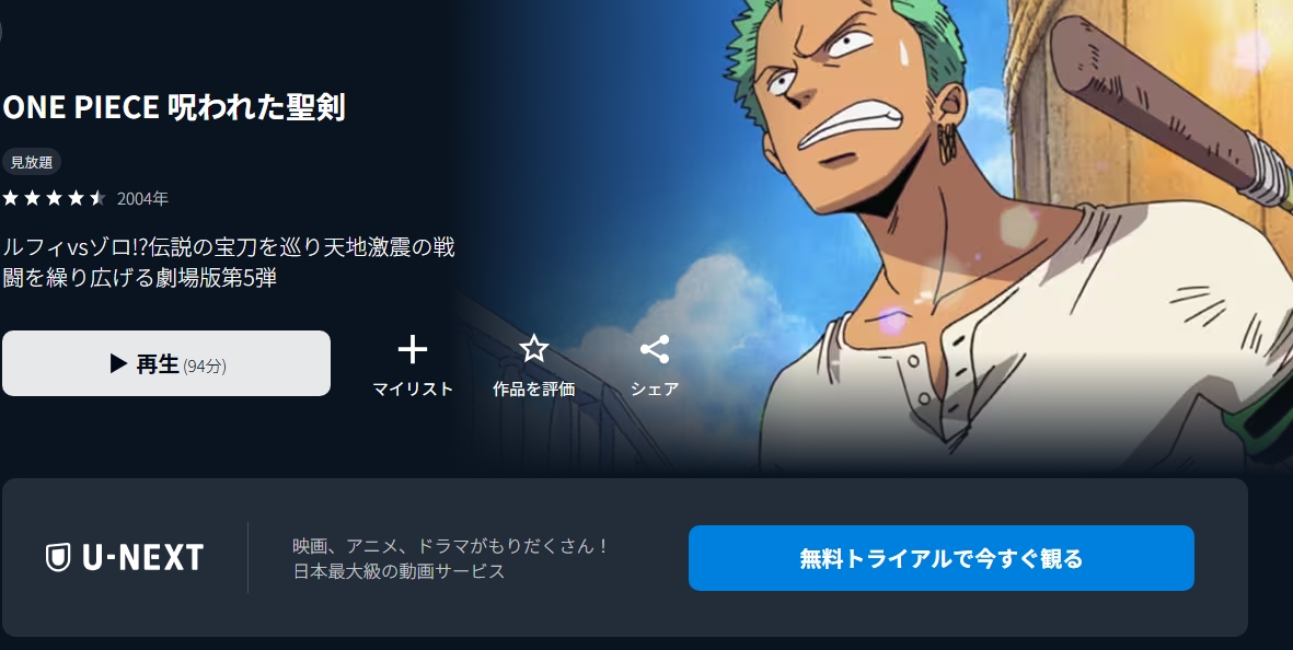 U-NEXTならお試し期間の無料期間中であれば、映画「ONE PIECE 呪われた聖剣」の動画をフルで”すぐに”視聴することができます。