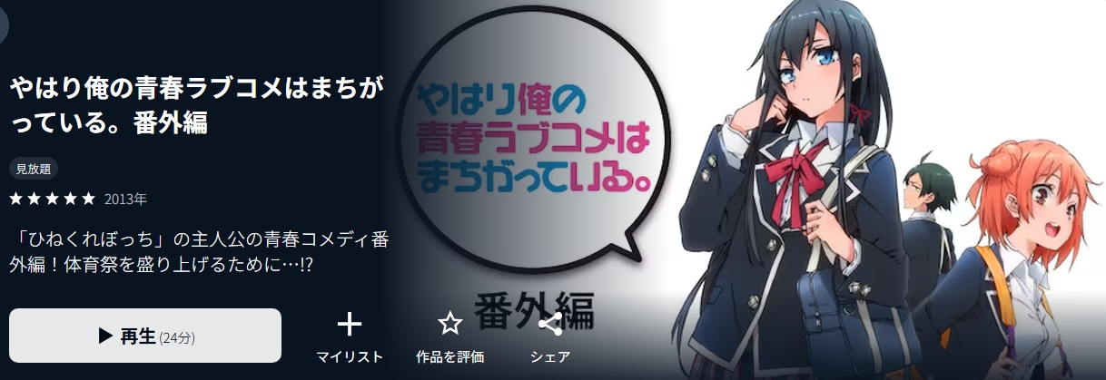 アニメ「やはり俺の青春ラブコメはまちがっている。番外編」の配信はどこで見れる?動画をフル視聴できる動画配信サービス!