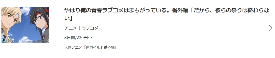 • アニメ「やはり俺の青春ラブコメはまちがっている。番外編」がフルで視聴可能。